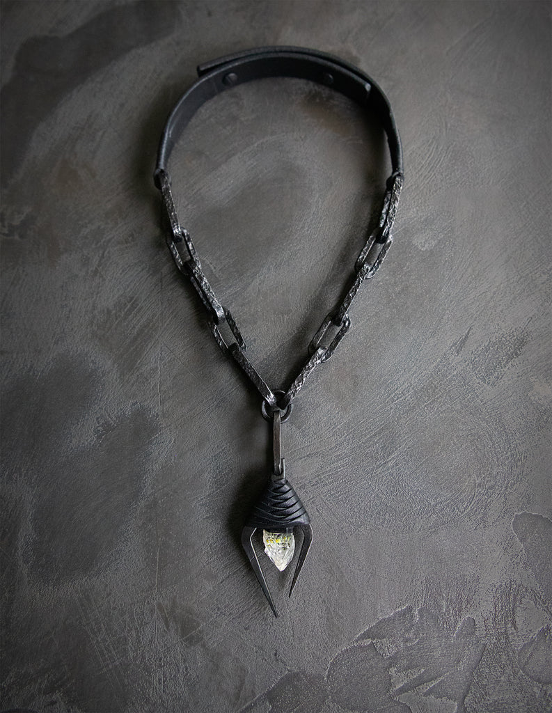 Textured hand-wrought iron chain + hand-wrought iron pendant.