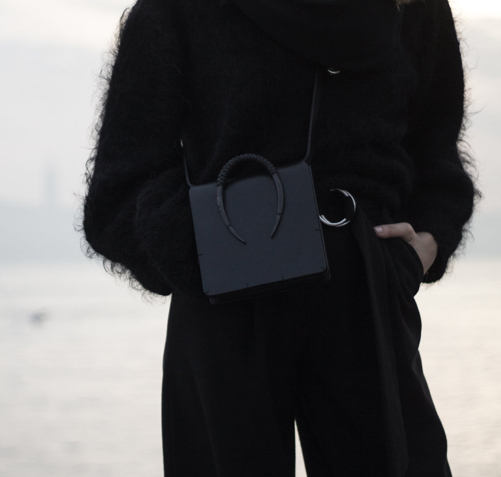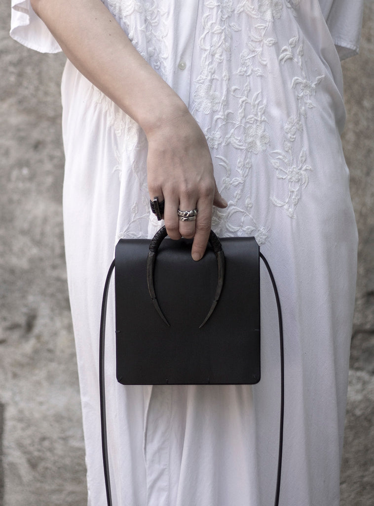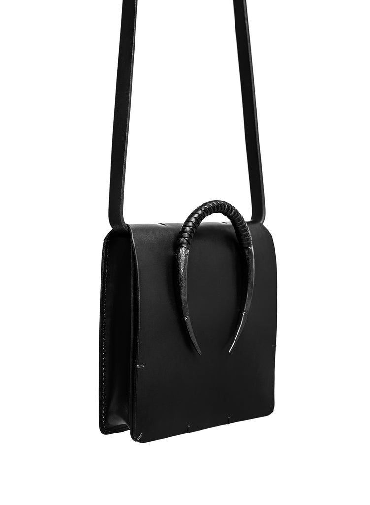 Vegetable tanned leather satchel bag with braided freehand wrought iron piece.