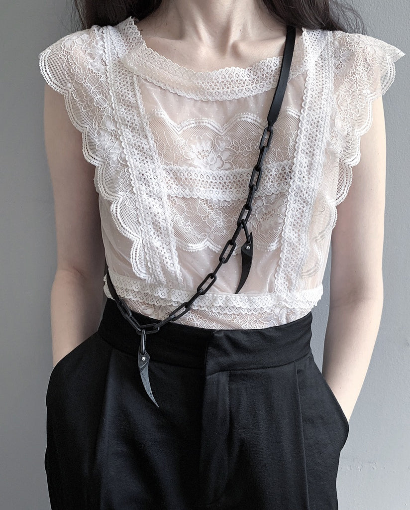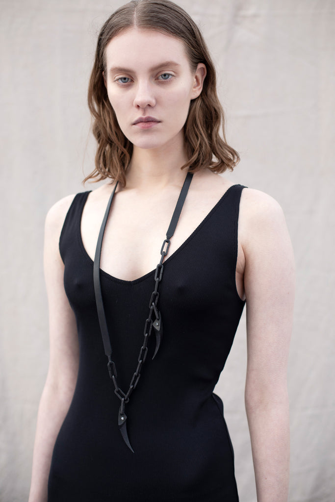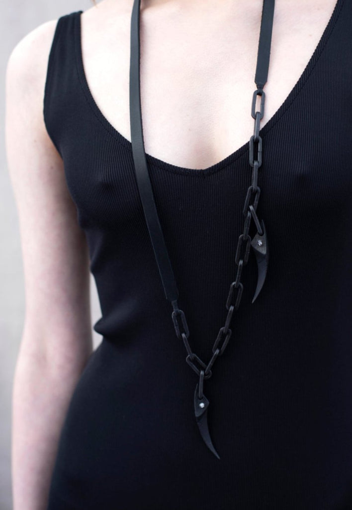 Long hand-wrought iron chain + two hand-wrought iron pendants or two sterling silver pendants.