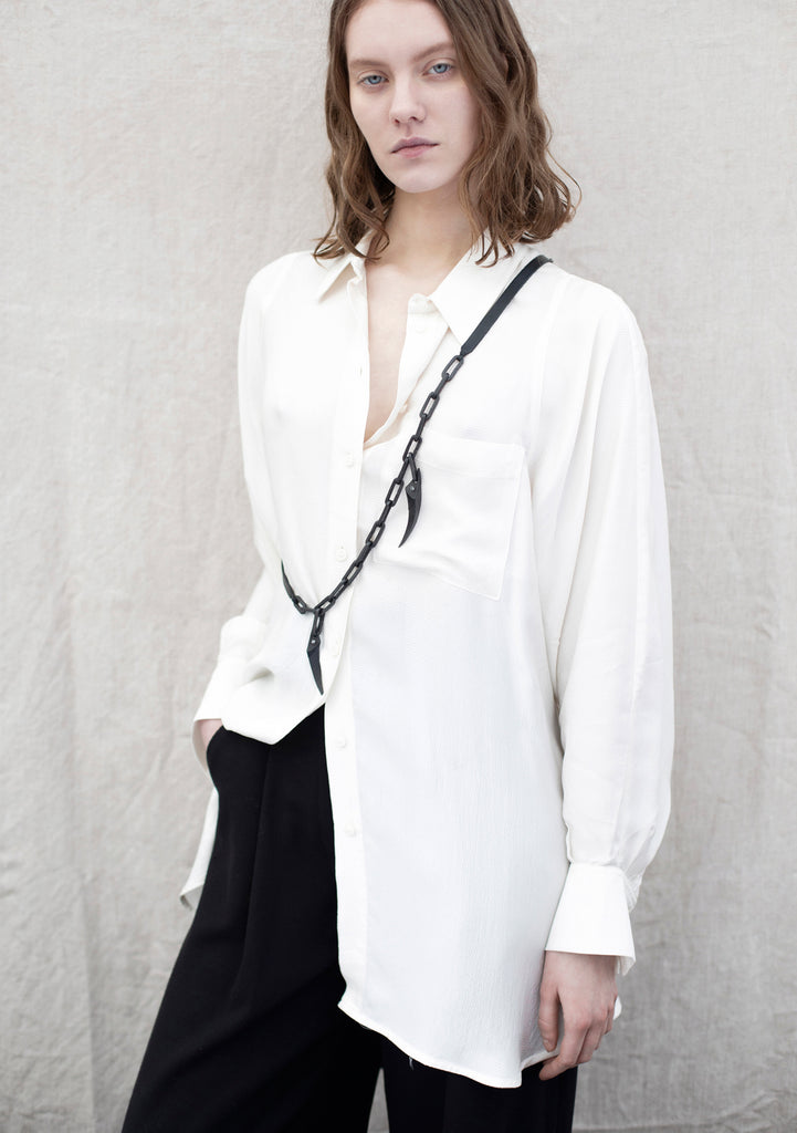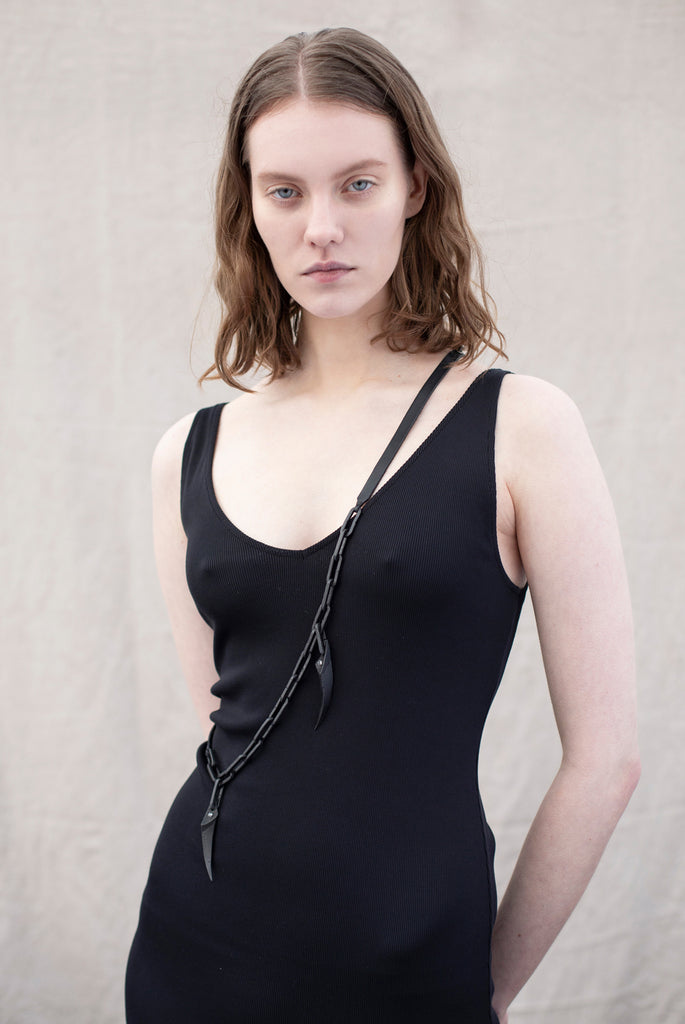 Vegetable tanned leather strap with 2 oxidised metal closures at back.