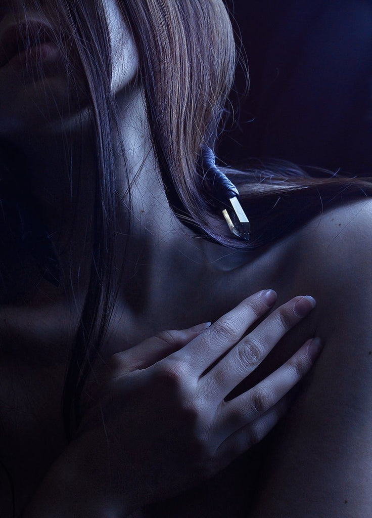 Quartz neck cuff wrapped in black vegetable tanned leather.